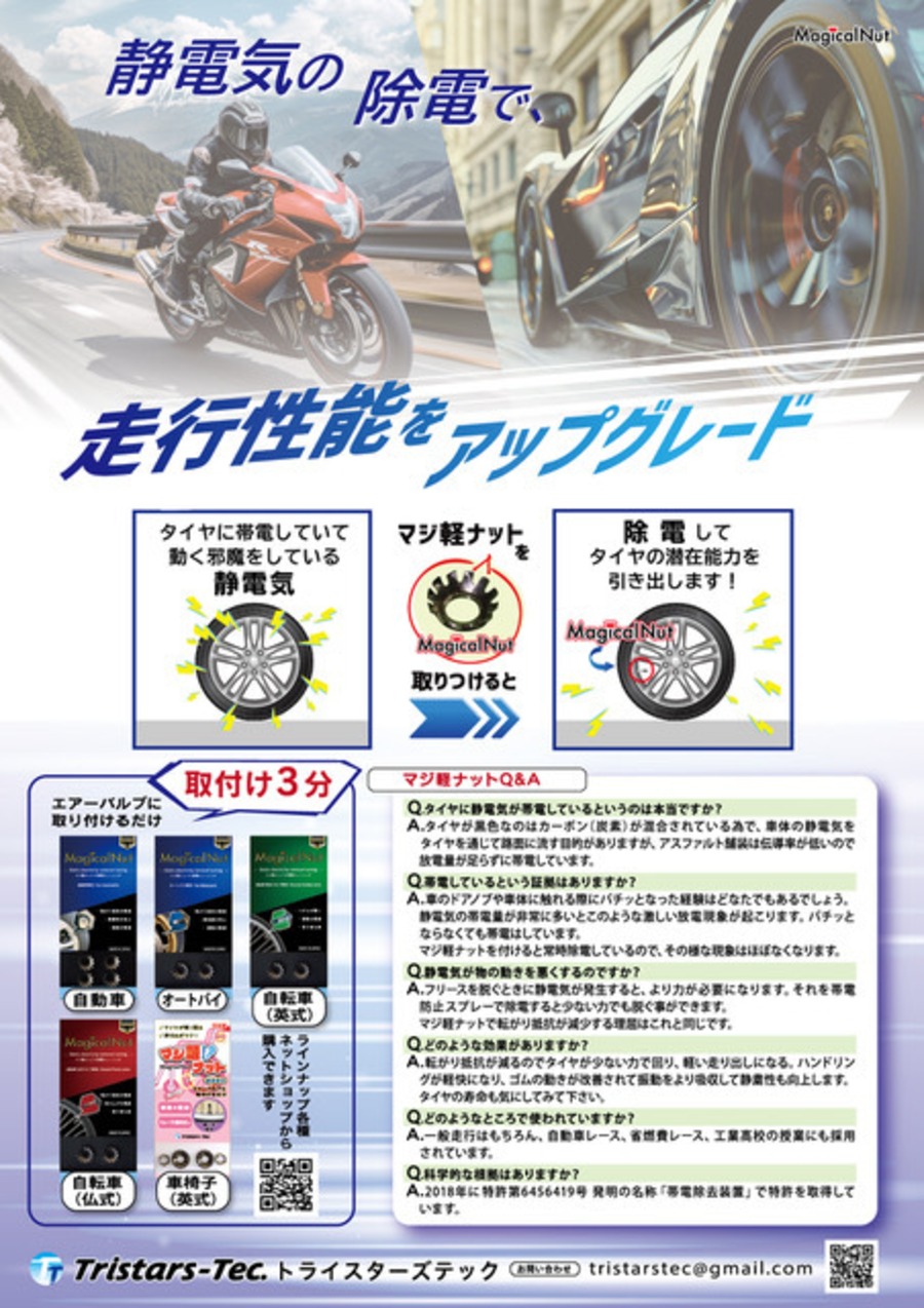 タイヤの動きを悪くしている静電気を特殊金属から放電させる(特許)事で、タイヤタイヤの転がり抵抗を減らして、接地感(路面を捉えている感じ)やハンドリング、道路の縦溝の走破性の向上、振動の軽減等、運転が快適になります。